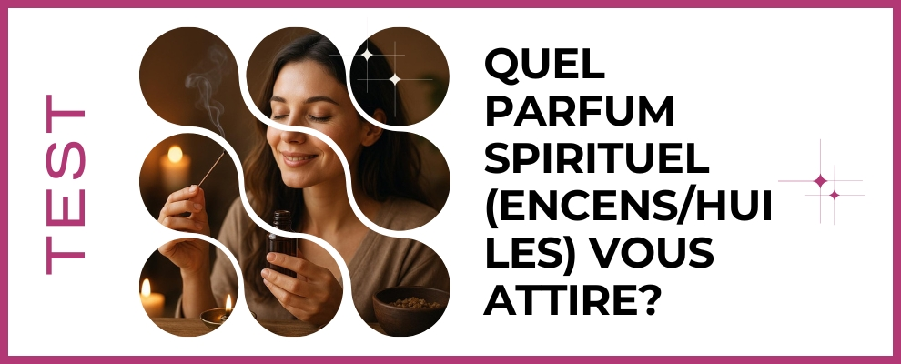 Découvrez quel parfum spirituel — encens ou huile essentielle — vous attire réellement grâce à ce test intuitif. En quelques questions ludiques, identifiez les senteurs qui résonnent avec votre âme, apaisent vos émotions et stimulent votre énergie. Que vous soyez adepte des notes boisées, florales ou résineuses, ce test vous guide vers la fragrance qui soutient votre chemin intérieur. Prêt·e à respirer votre essence profonde et accueillir votre lumière.